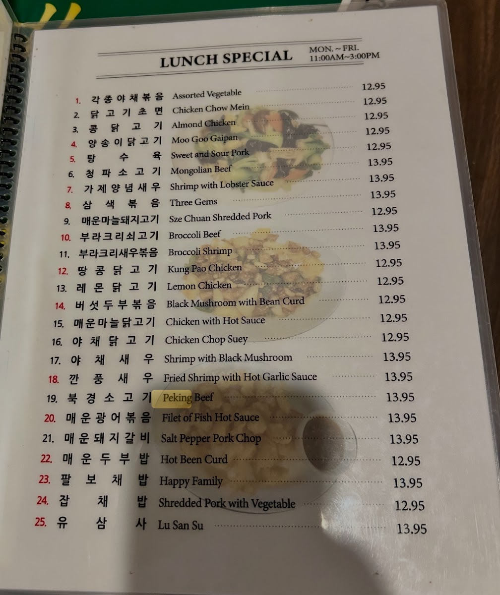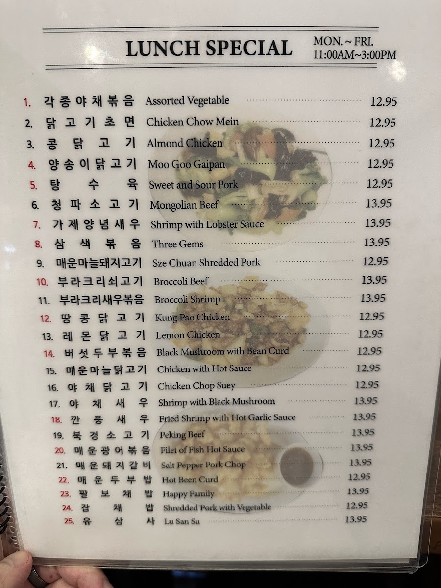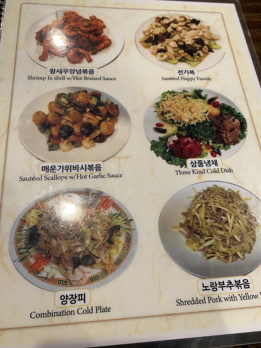 The menu highlights also include noodle dishes and specialty items like Black Bean Noodles, Jjampong (짬뽕), Jajangmyeon, Honey Walnut Shrimp, Sweet and Sour Pork, Fried Meat Dumplings, Mongolian Beef, Fried Calamari, and Hot Braised String Beans, providing a diverse range of protein and vegetable options.