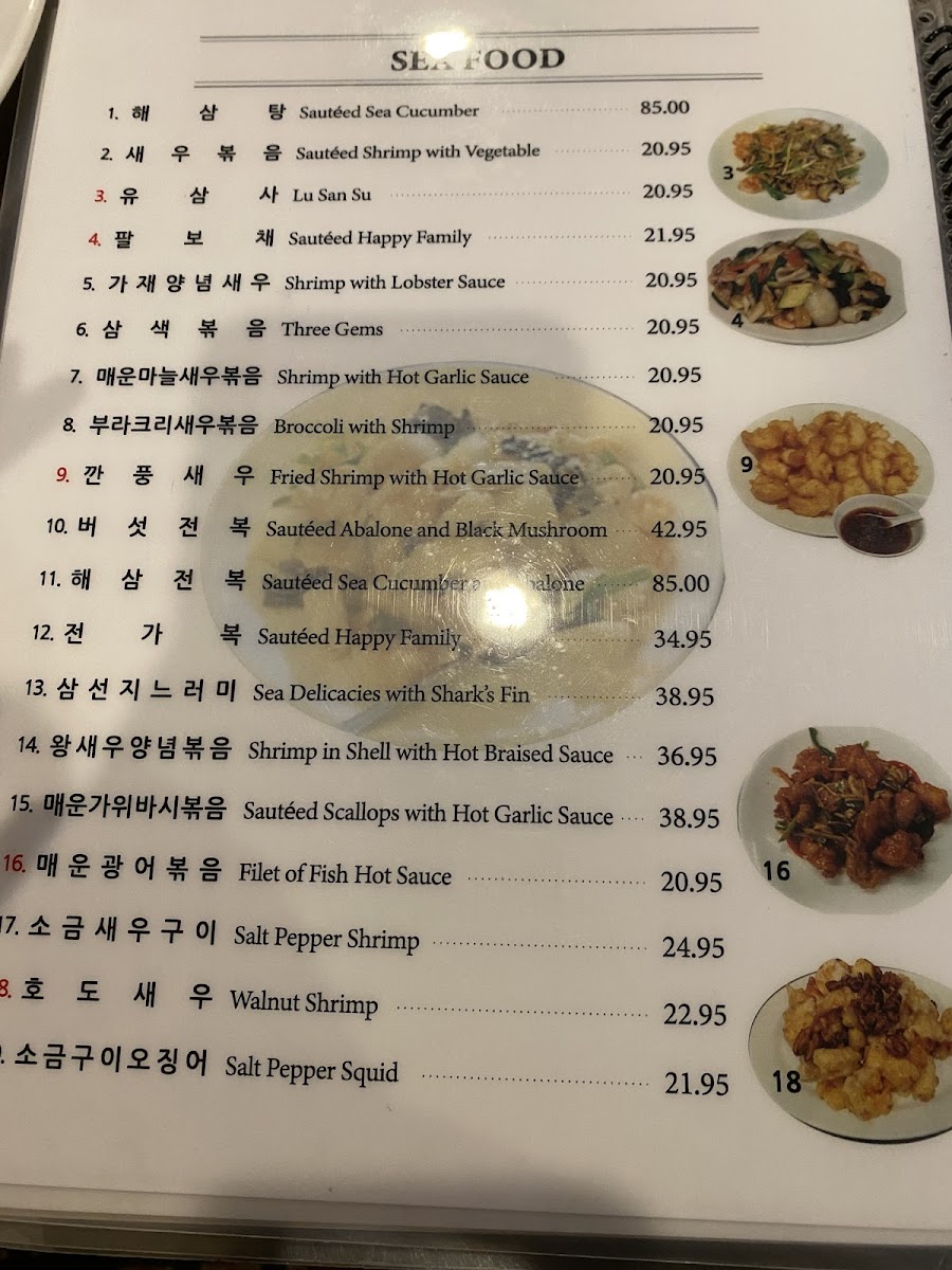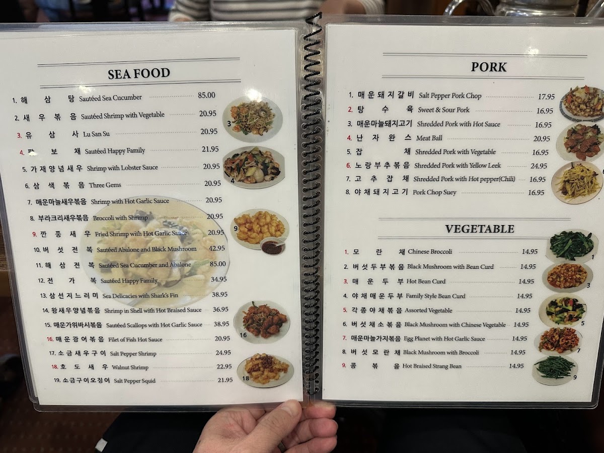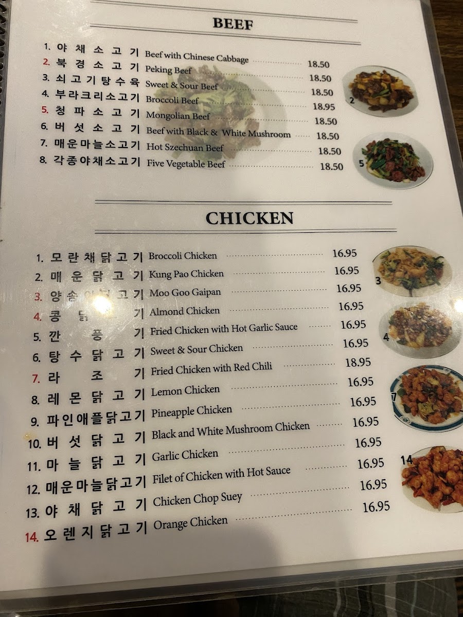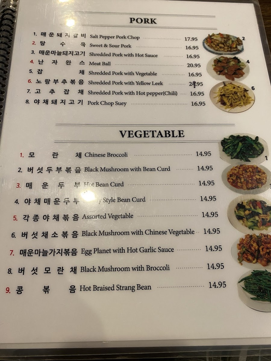 The menu highlights also include noodle dishes and specialty items like Black Bean Noodles, Jjampong (짬뽕), Jajangmyeon, Honey Walnut Shrimp, Sweet and Sour Pork, Fried Meat Dumplings, Mongolian Beef, Fried Calamari, and Hot Braised String Beans, providing a diverse range of protein and vegetable options.